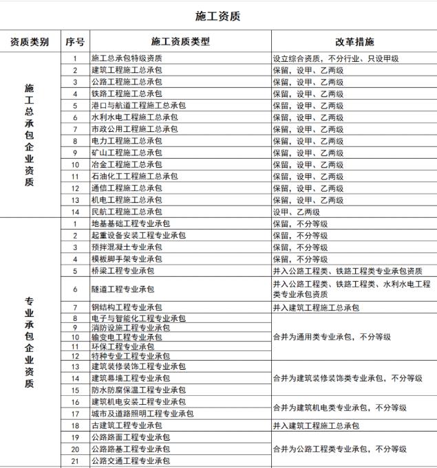 保留原12類施工總承包資質(zhì)。施工總承包資質(zhì)等級壓減為甲、乙兩級,甲級資質(zhì)在本類別內(nèi)承攬業(yè)務(wù)規(guī)模不受限制,原一級資質(zhì)調(diào)整為甲級資質(zhì),其他等級資質(zhì)合并為乙級資質(zhì)。